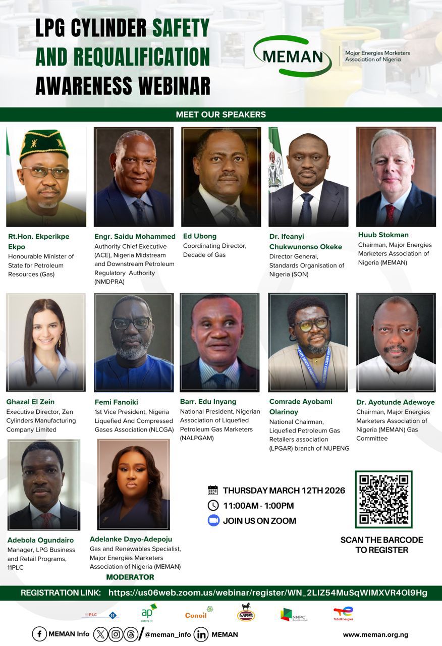 Join MEMAN for a high-impact awareness webinar on LPG Cylinder Safety & Requalification, designed to protect lives, strengthen market standards, and promote responsible gas usage across Nigeria.