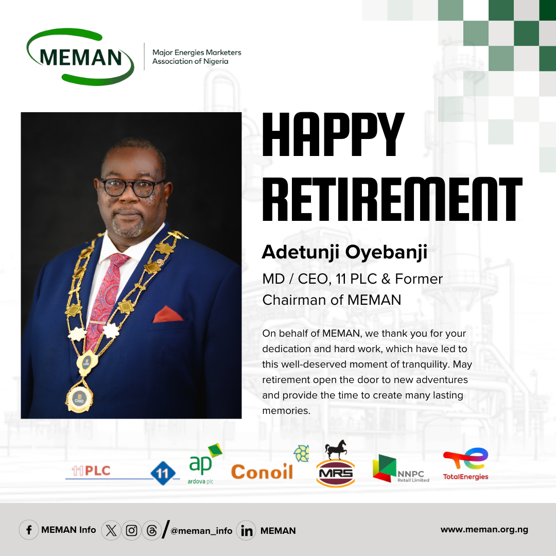 The Major Energies Marketers Association of Nigeria (MEMAN) is an energy industry association led by Mr Clement Isong, who serves as the Executive Secretary and CEO. The Association comprises a distinguished lineup of reputable companies: 11Plc (formerly Mobil), Ardova Plc, Conoil Plc, MRS Oil Nigeria Plc, NNPC Retail Limited, and TotalEnergies Marketing Nigeria Plc.